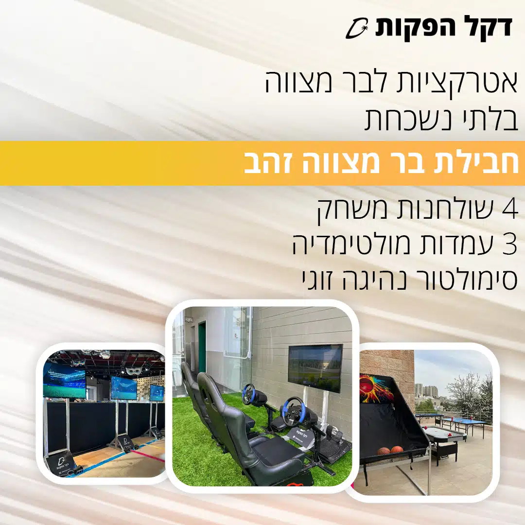 חבילה אטרקציות לבר מצווה זהב מציעה מכלול חוויות מהנות, מאורגנות ומסודרות, כך שתוכלו להיות שקטים ולדעת שהכול מטופל. השילוב של משחקי שולחן, עמדות מולטימדיה וסימולטור נהיגה + שירות מקצועי מלא יבטיחו אירוע מוצלח שבו כל אורח ימצא את מקומו. בחירה בחבילה זו היא השקעה, אך היא תותיר חותם חיובי על האורחים ותהפוך את הבר מצווה לחוויה מרגשת ובלתי נשכחת.