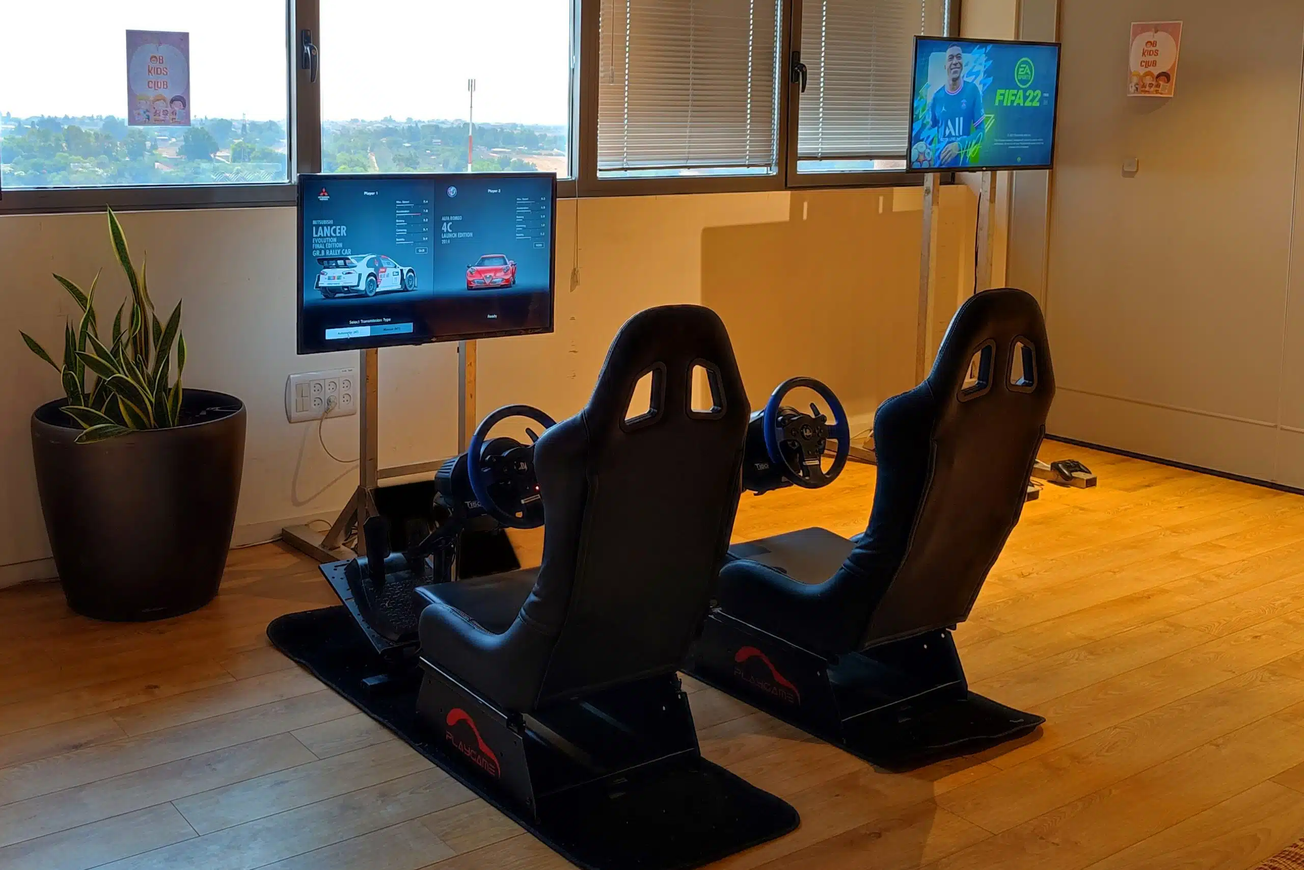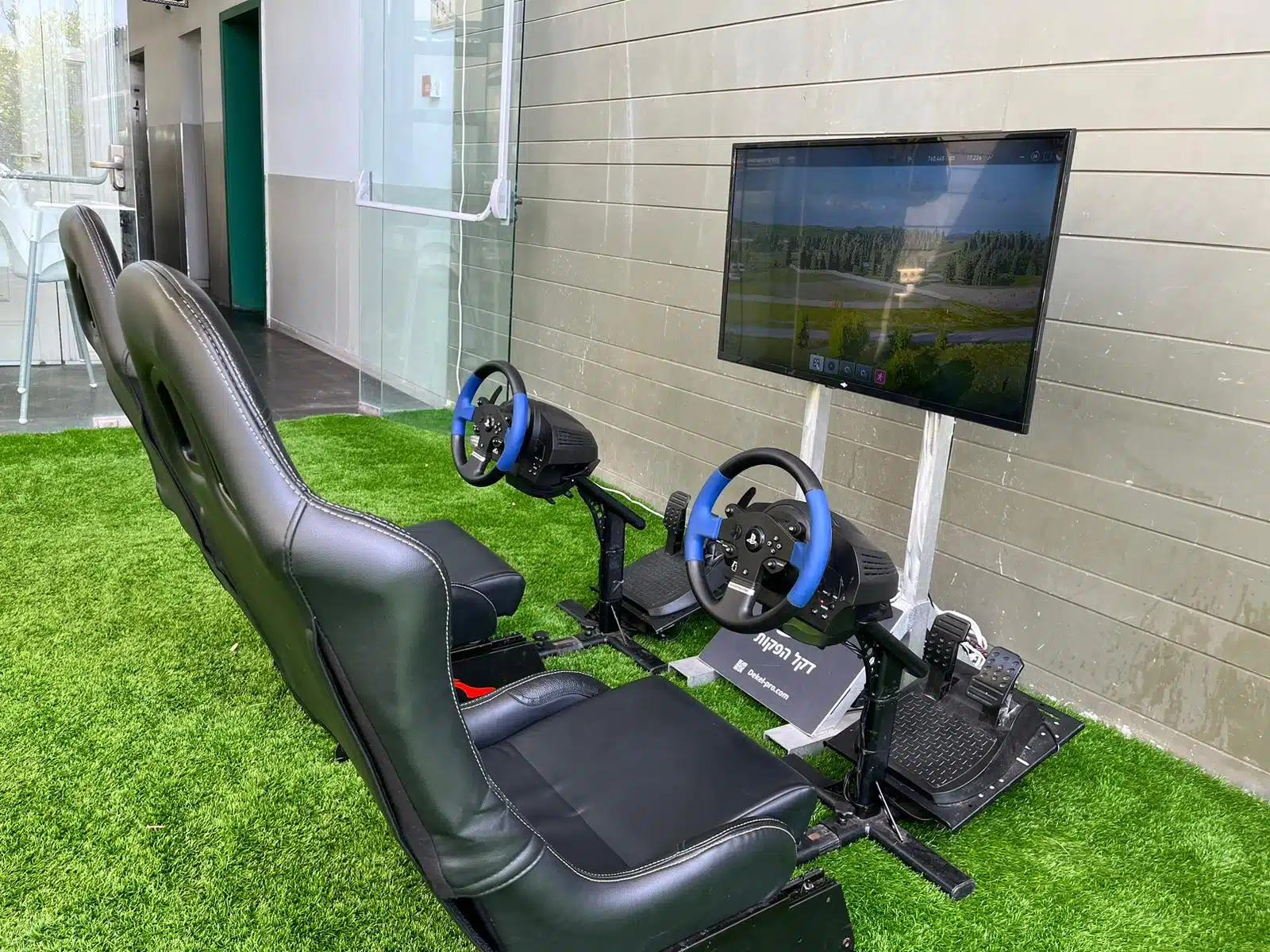עמדת נהיגה זוגי בסימולטור חדשני לאירועים, הסימולטור מדמה נהיגה מציאותית בכיסא ספורט, הגה מקצועי ומשחק המסונכרן מול הסימולטור במסך. כך ששני הנהגים המתחרים במשחק מרגישים בהגה את תנאי הדרך וחווים את המשחק בצורה מושלמת במיוחד.