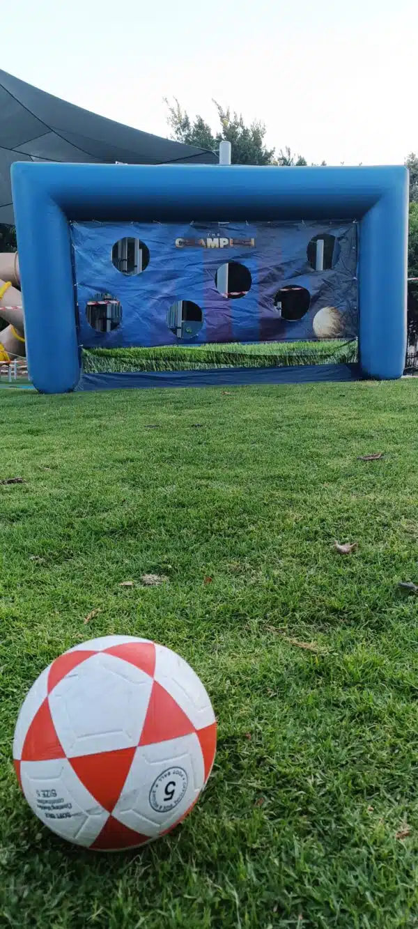 שער כדורגל מתנפח לאירועים, השער מכוסה ברשת עם חורים כשהשחקן צריך להכניס באחד מהם תוך שלושה נסיונות.